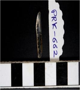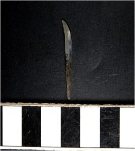 | Description / विवरण | A chalcedony blade with double ridge on dorsal side, trapezoid cross section, sharp cutting edges and pointed at one end. |