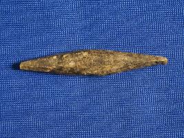 | Description / विवरण | Bone point, showing double ended point, roughly made. Flake scars. Blackish color. |