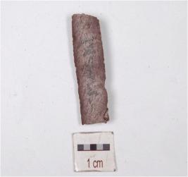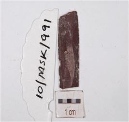 | Description / विवरण | A blade made on chert, trapezoidal cross section, proximal end broken and use marks along the cutting edges. |