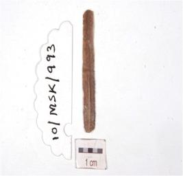 | Description / विवरण | A blade made on chert having mid ridge on dorsal side, prepared platform, bulb absent and use marks along the cutting edges. |