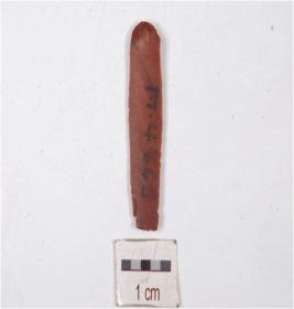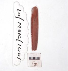| Description / विवरण | A blade made on chert having two ridges on dorsal side, prominent bulb on ventral side, prepared platform, trapezoidal cross section, distal end broken and use marks along the cutting edges. |