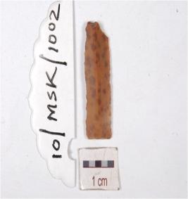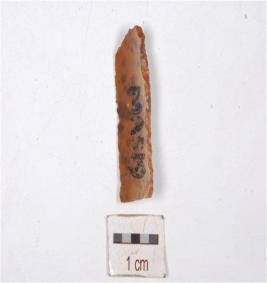 | Description / विवरण | A blade made on chert having prepared platform mid ridge on dorsal side, triangular cross section, bulb absent, distal end broken and use marks along the cutting edges. |