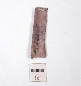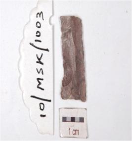 | Description / विवरण | Fragment of a blade made on chert having a ridge on dorsal side, triangular cross section, and use marks along the cutting edges. |