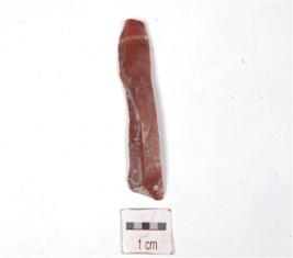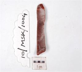 | Description / विवरण | A blade made on chert having a ridge on dorsal side, prepared platform, prominent bulb on ventral side and use marks along the cutting edges. |