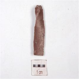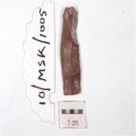 | Description / विवरण | A blade made on chert having two ridges on dorsal side, trapezoidal cross section, prepared platform, prominent bulb on ventral side, distal end broken and use marks along the cutting edges, |