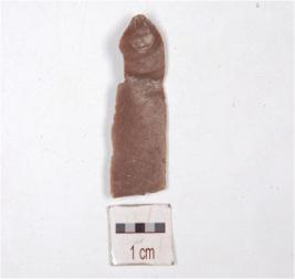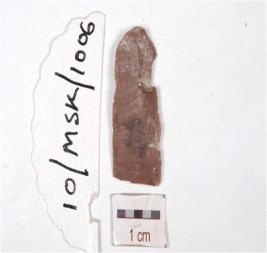 | Description / विवरण | Fragment of a blade made on chert having prepared platform, prominent bulb on ventral side, trapezoidal cross section and use marks along the cutting edges. |