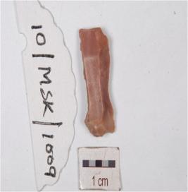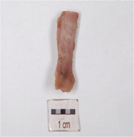 | Description / विवरण | A blade made on chert having a ridge on dorsal side, prepared platform, bulb absent and use marks along one cutting edge. |
