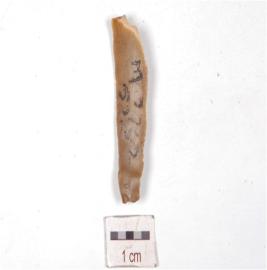 | Description / विवरण | A blade made on chert having mid ridge on dorsal side, prepared platform, prominent bulb on ventral side and use marks along the cutting edges. |