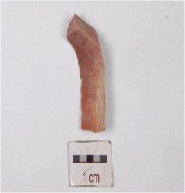 | Description / विवरण | Fragment of a blade made on chert having trapezoidal cross section, use marks along the cutting edges and distal end broken. |