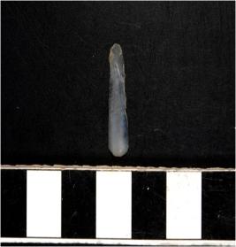| Description / विवरण | A chalcedony blade with double ridge on dorsal side, trapezoid cross section, sharp cutting edges and pointed at one end. |