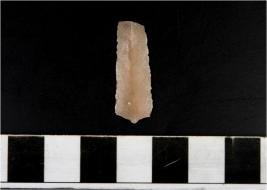 | Description / विवरण | A chert blade with single ridge on dorsal side, triangular section and sharp cutting edges. |