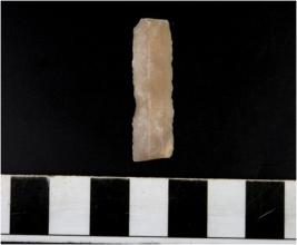 | Description / विवरण | A chert blade with double ridge on dorsal side, trapezoid cross section and sharp cutting edges. |