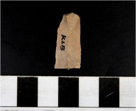 | Description / विवरण | A chert blade with single ridge on dorsal side, triangular cross section, bulb on ventral side and sharp cutting edges. |