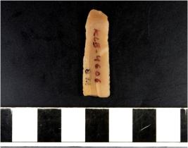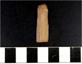 | Description / विवरण | A chert blade with double ridge on dorsal side, trapezoid cross section, sharp cutting edge. |
