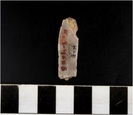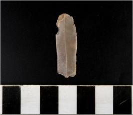 | Description / विवरण | A chert blade with single ridge on dorsal side, triangular cross section and blunt cutting edge. |