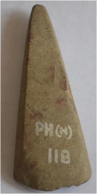 This is the Neolithic polished tool. Neolithic celt. made by sandstone. the lower part of a tool chipped out.