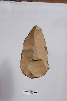 | Description / विवरण | Pear shape hand axe. Both sides contains deep and large flake scars. Tip is pointed with broad butt . In cross section this hand axe is biconvex .In middle there is patches of original cortex. |