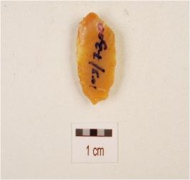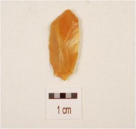 | Description / विवरण | A blade, made on chert with double ridge on dorsal side, bulb on ventral, use wear marks on cutting edge and trapezoid in section. |