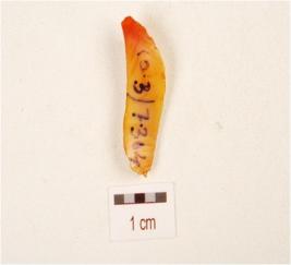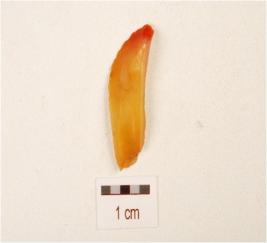 | Description / विवरण | A blade, made on carnelian with double ridge on dorsal side, trapezoid in section, use-wear marks on cutting edge, orange in colour and bulb on ventral side. |