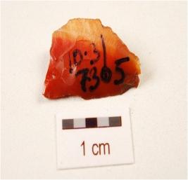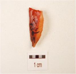 | Description / विवरण | A blade, made on carnelian with prominent mid ridge on dorsal side, use wear marks on cutting edge, triangular in section and dark red in colour. |