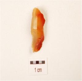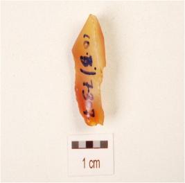 | Description / विवरण | A blade, made on carnelian with prominent mid ridge on dorsal side, use wear marks on cutting edge, triangular in section and dark red in colour. |