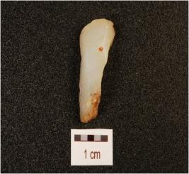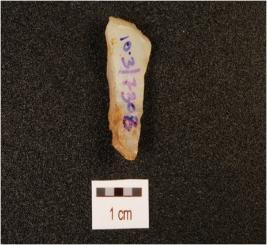 | Description / विवरण | A blade, made on chalcedony with double ridge on dorsal side, use wear marks on cutting edge, trapezoid in section and white in colour. |