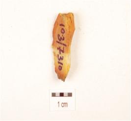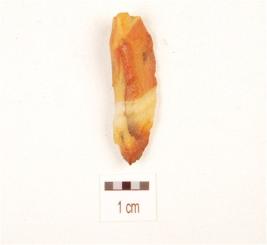 | Description / विवरण | A blade, made on chert with prominent mid ridge on dorsal side, use wear marks on cutting edge and triangular in section. |