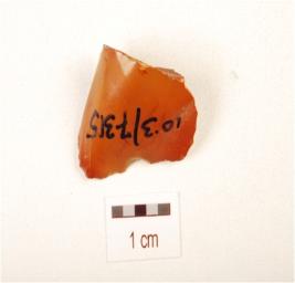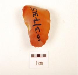 | Description / विवरण | A core, made on chert with three blade scars on dorsal side, smooth ventral, triangular in section, use wear marks on cutting edge and dark red in colour. |