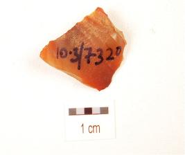 | Description / विवरण | A flake, made on carnelian end struck flake with prepared platform, bulb on ventral, use wear marks on edge and orange in colour. |