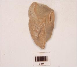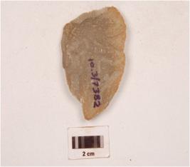 | Description / विवरण | A quartzite end struck utilized flake, prepared platform, prominent bulb on ventral side, plano convex in cross section and use-wear marks along the cutting edge. |
