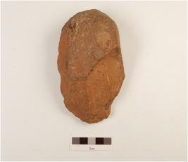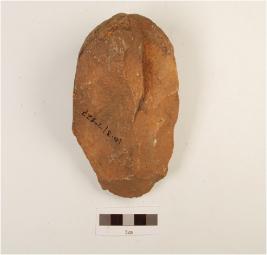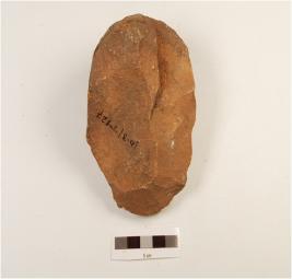 | Description / विवरण | An bifacial chopping made on quartzite pebble, flake scars on both side surface, wavy cutting edge on interior cortex on butt end and plano-convex section. |