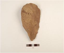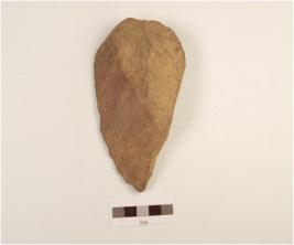 | Description / विवरण | A handaxe made on pebble quartzite, pointed on one side, plano-convex section, flake scars on both side, diffused bulb, wavy cutting edge and contex on butt end. |