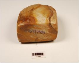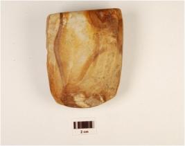 | Description / विवरण | Chert core with blade and flake scars on surface, one end flat other end tapering, rectangular cross section and band visible on surface. |