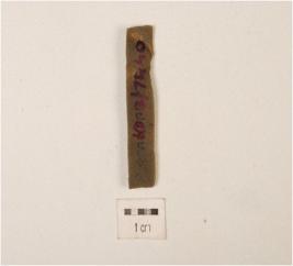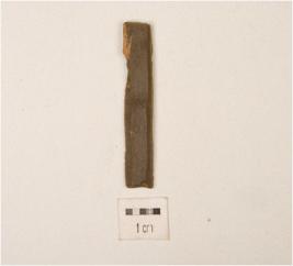 | Description / विवरण | Stone blade with sharp working edge on both sides, flake scars on surface and broken at both ends. |