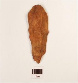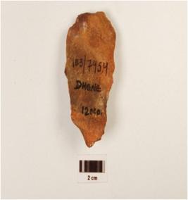 | Description / विवरण | A chert mini hand axe made on end struck flake, prepared platform, diffused bulb at ventral side, single ridged with flake scars on the surface. |