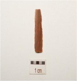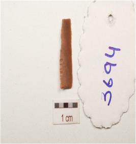 | Description / विवरण | A blade made on chert, a mid ridge on the dorsal side, use wear marks along cutting edges and triangular section. |