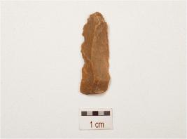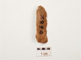 | Description / विवरण | Chert, parallel sided blade with a mid ridge on dorsal side, striking platform, diffused bulb on ventral side, irregular retouches on cutting edges and triangular in section. |
