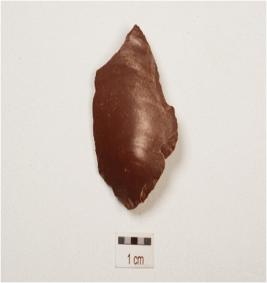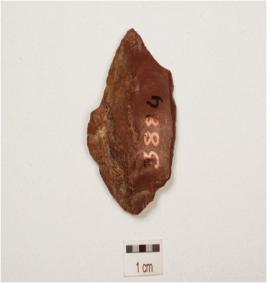 | Description / विवरण | A chert flake with a prominent ridge on dorsal side, striking platform , bulb on ventral side, broken along at distal end and irregular retouches on working edge. |