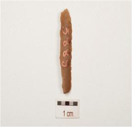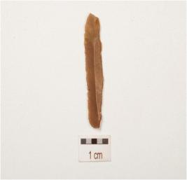 | Description / विवरण | Chert, parallel sided blade with a prominent ridge on dorsal side, both ends are broken irregular retouches on cutting edge and triangular in section. |