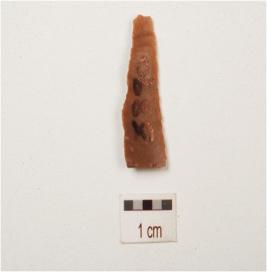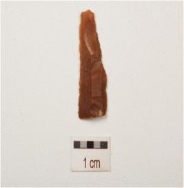 | Description / विवरण | Chert, parallel sided blade with two ridge on dorsal side,broken from both ends, use wear marks on working edge and trapezoidal in section. |