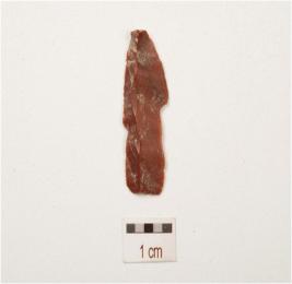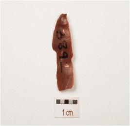 | Description / विवरण | Chert, blade with a prominent ridge on dorsal side, striking platform, diffused bulb on ventral side, use wear marks along at cutting edges, broken along at distal end and triangular in section. |