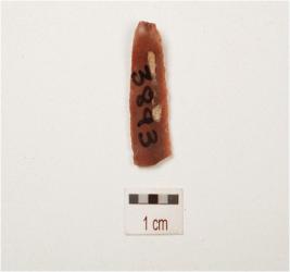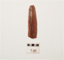 | Description / विवरण | Chert, parallel sided blade with two ridge on dorsal side, striking platform diffused bulb on ventral side, use wear marks on cutting edges, broken distal end and trapezoidal in section. |