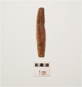 | Description / विवरण | Chert, parallel sided blade with two ridge on dorsal side, striking platform, diffused bulb on ventral side, use wear marks on cutting edge, broken from distal end and trapezoidal in section. |