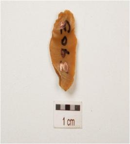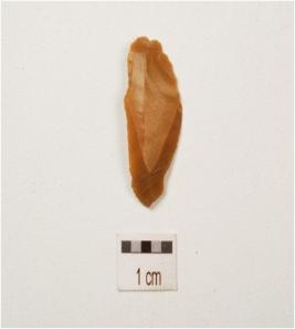 | Description / विवरण | Chert blade with three ridges on dorsal side, diffused bulb on ventral side, use wear marks along at cutting edges, broken along at distal end and triangular in section. |