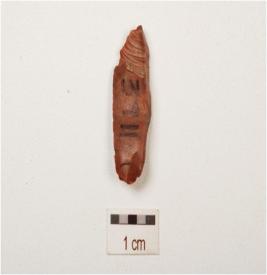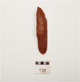 | Description / विवरण | A chert blade on core with three blade scars on dorsal side, bulb on ventral side and use wear marks on cutting edge. |