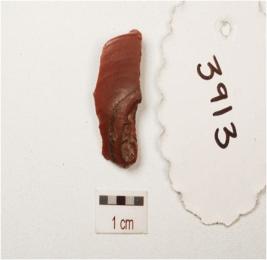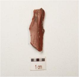 | Description / विवरण | Chert balde with a mid ridge on dorsal side, striking platform, chipped off bulb with ripple marks on ventral side, one edge is partly broken irregular retouches on other cutting edge and triangular in section. |