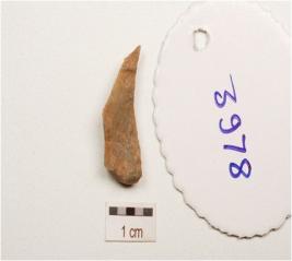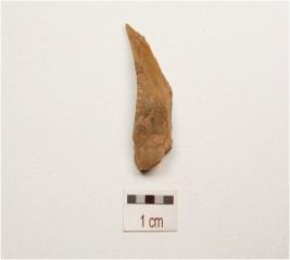 | Description / विवरण | A flake made on chert, end struck flake, flat one end pointed other end and flake scars on surface. |