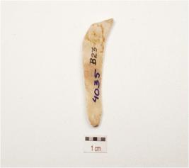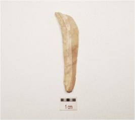 | Description / विवरण | A chert blade with double ridge on dorsal, diffused bulb on ventral, prepared platform, trapezoidal section use wear marks on cutting edge and broken along distal end. |