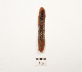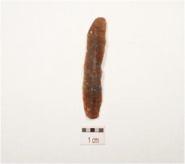 | Description / विवरण | A chert blade with a mid ridge on dorsal, triangular in section, bulb on ventral, prepared platform use wear marks on cutting edge and broken along distal end. |