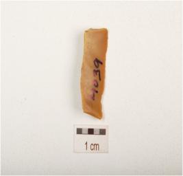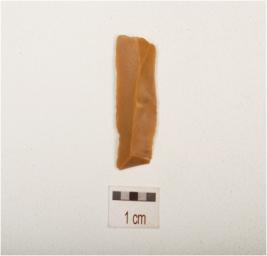 | Description / विवरण | Fragment of chert parallel sided blade with prominent mid ridge on dorsal, triangular section, use wear marks on cutting edge, broken along proximal end. |